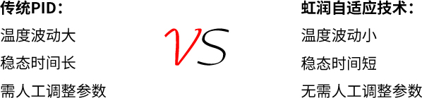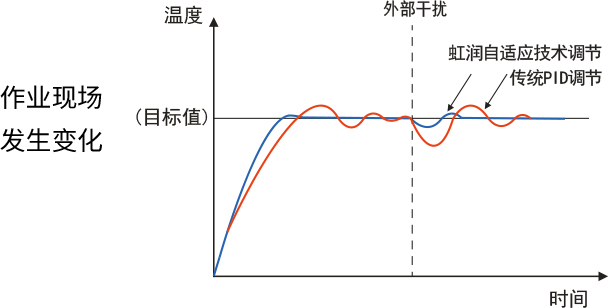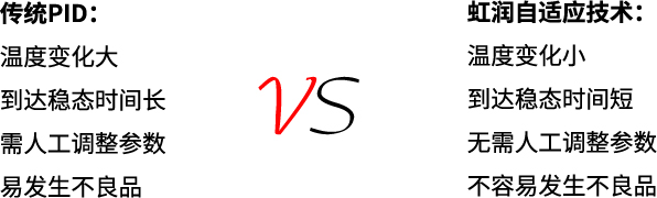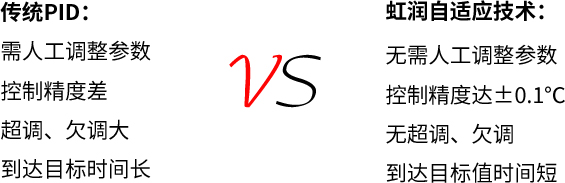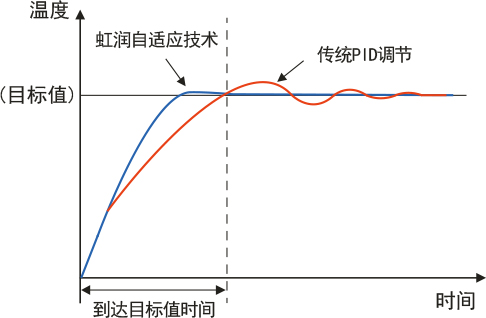 虹潤自適應(yīng)控制技術(shù)可自動整定出較佳PID值。監(jiān)視裝備的溫度控制狀態(tài),自動調(diào)節(jié)PID值,對工件變化及裝備變化、環(huán)境變化等進行較佳溫度控制。