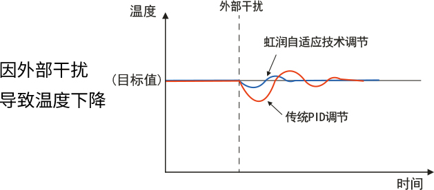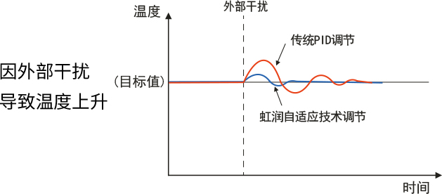 虹潤自適應(yīng)技術(shù)自動抑制常規(guī)干擾引起的溫度波動,針對開關(guān)艙室門時外部空氣的流入等可預(yù)測的溫度波動,穩(wěn)定地進行自動控制。提高品質(zhì),縮短溫度變化穩(wěn)定所需的時間,且將溫度波動控制在較小限度,為提高生產(chǎn)能力做出貢獻。