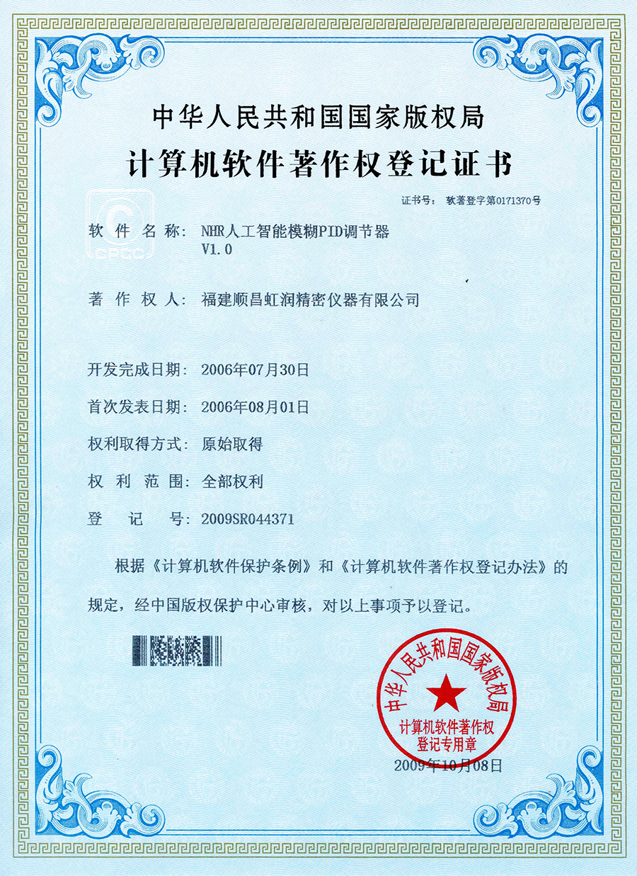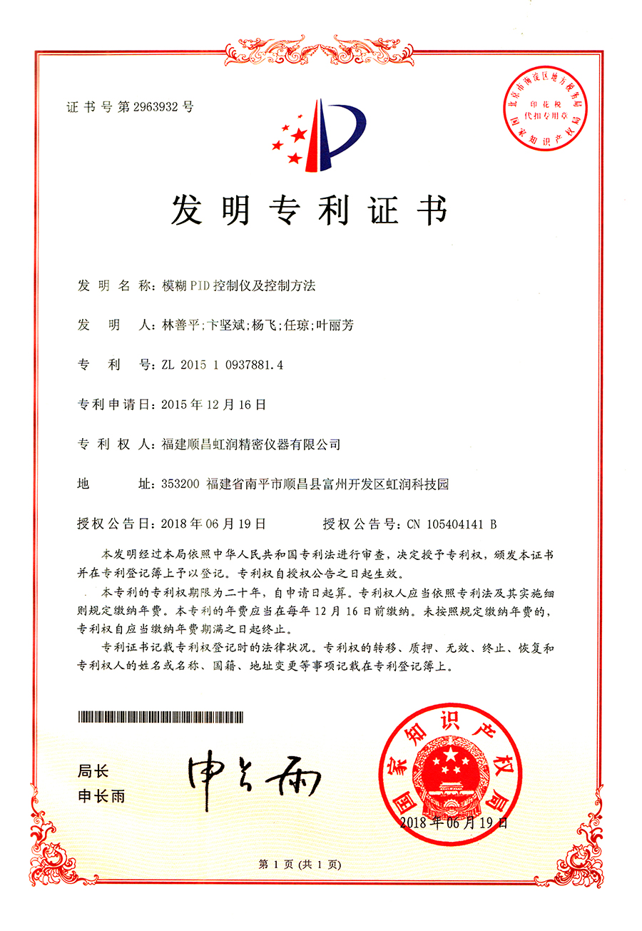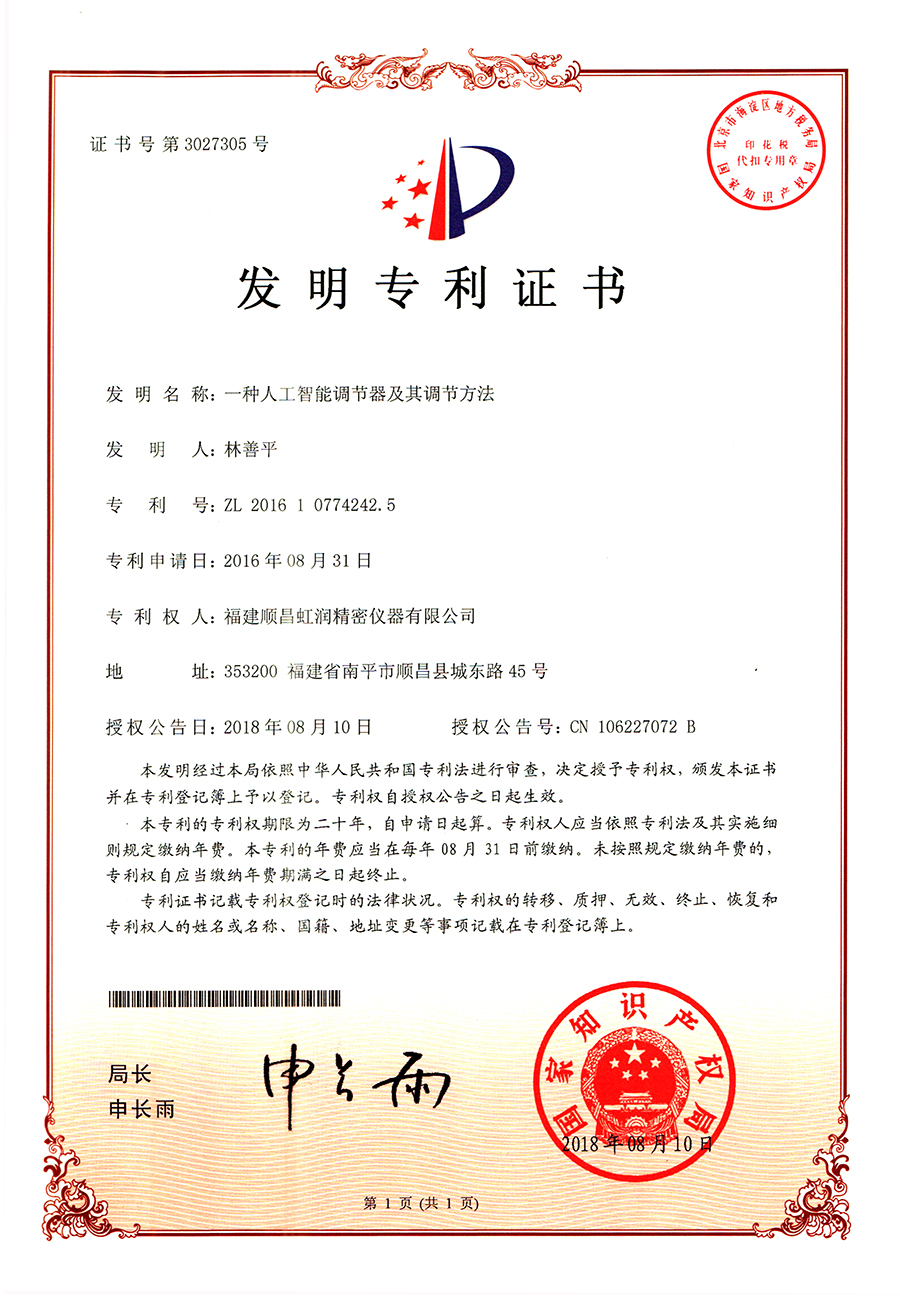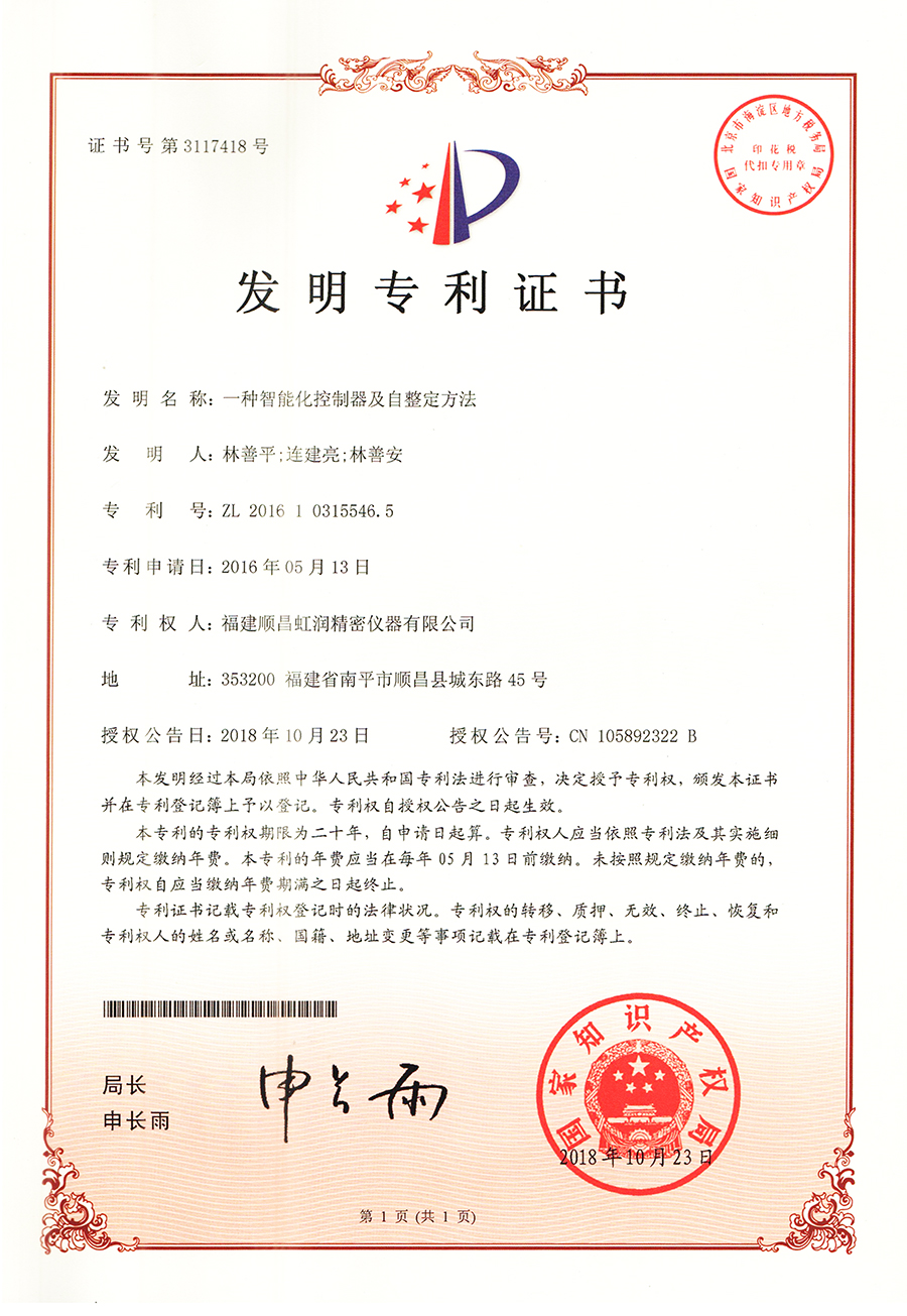 虹潤于2015年推出人工智能算法的溫控器。經(jīng)過長時間現(xiàn)場使用,溫控器無需人工整定參數(shù),無超調(diào)、欠調(diào),控溫精度高,基本達±0.1℃,得到用戶一致好評??刂扑惴ǐ@4項發(fā)明專利,主持起草2項國家標準,獲得6項軟件著作權(quán)。