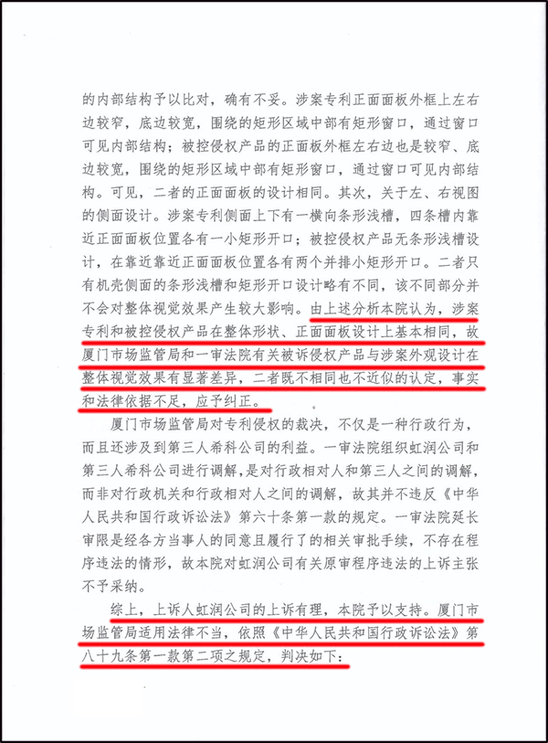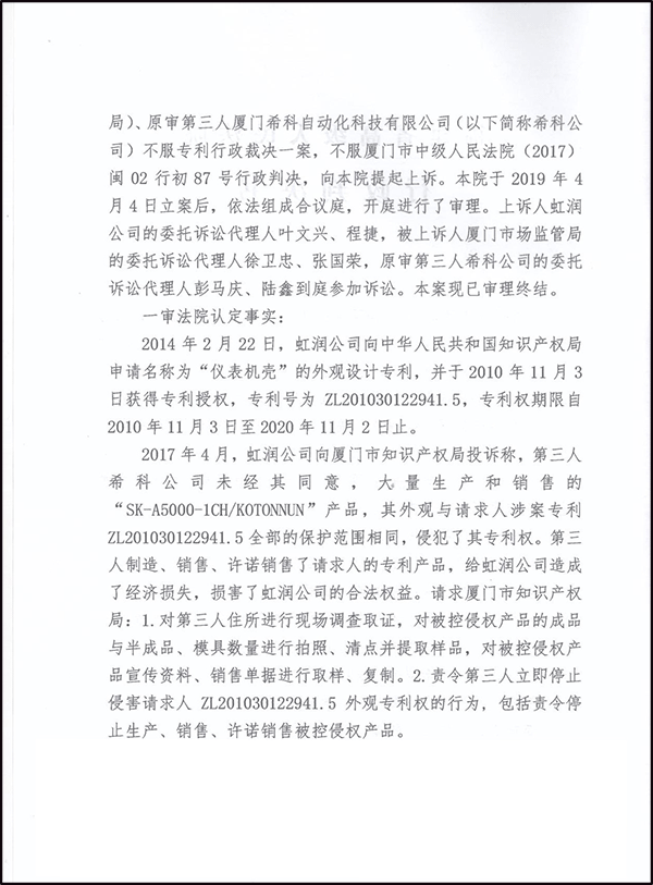 2015年9月福建順昌虹潤精密儀器有限公司(以下簡稱虹潤公司)在市場上發(fā)現(xiàn)廈門??谱詣踊萍加邢薰荆ㄒ韵潞喎Q??乒荆┪唇?jīng)虹潤公司同意,大量生產(chǎn)和銷售仿冒虹潤NHR-8000系列無紙記錄儀的侵權(quán)產(chǎn)品??艫5000、A6000無紙記錄儀。侵犯了虹潤公司的知識產(chǎn)權(quán)。虹潤公司于2016年先發(fā)函告知??乒局兄骨謾?quán)行為,但??乒静挥枥頃榱司S護(hù)自身的合法權(quán)益,虹潤公司又向廈門市市場監(jiān)督管理局(原廈門市知識產(chǎn)權(quán)局)申請行政處理,后再提起行政訴訟。2019年7月30日,福建省高級人民法院作出【2019】閩行終302號行政判決書,認(rèn)定??乒旧a(chǎn)的產(chǎn)品與我司的“儀表機(jī)殼”外觀設(shè)計(jì)專利整體形狀、正面面板設(shè)計(jì)上基本相同。至此,虹潤公司歷時(shí)四年的維權(quán)行為得到了法律支持,福建省高院終審認(rèn)定廈門??茻o紙記錄儀專利侵權(quán)。