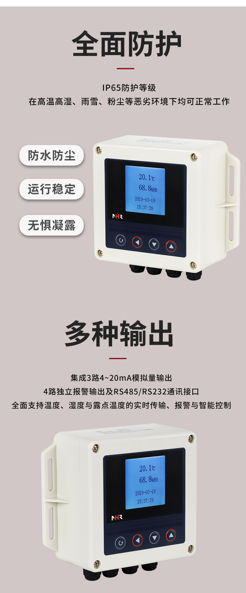 虹潤公司是專業(yè)生產(chǎn)環(huán)境監(jiān)測儀表的國家專精特新“小巨人”企業(yè)。生產(chǎn)的壁掛式溫濕度控制器,具有溫度、濕度、露點高精準的測量,多種輸出類型,穩(wěn)定性強,RS485/RS232通訊,IP65防護等級等特點。產(chǎn)品獲得一種手持式低功耗溫濕度檢測儀、大屏幕溫濕度記錄儀等2項國家發(fā)明專利,主持起草物聯(lián)網(wǎng)智能溫度儀表通用技術(shù)條件、冷鏈溫度記錄儀等2項國家標準,通信系統(tǒng)多通道數(shù)據(jù)采集控制終端規(guī)范軍用標準,以及現(xiàn)場設備集成等5項智能制造國家標準,參與國際5G標準制定,取得溫濕度儀表等2項相關(guān)軟件著作權(quán)。產(chǎn)品廣泛應用于工業(yè)現(xiàn)場、農(nóng)業(yè)大棚、倉儲物流、地下管廊、養(yǎng)殖孵化、配電機房等諸多領(lǐng)域。