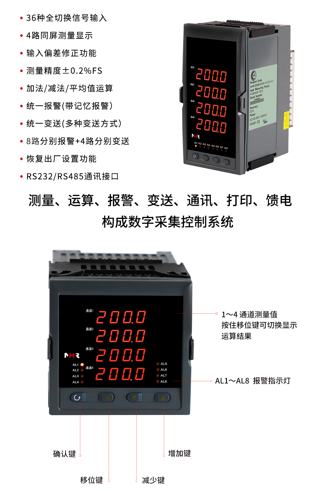 虹潤公司是專業(yè)生產(chǎn)多路溫度巡檢儀的國家專精特新“小巨人”企業(yè),生產(chǎn)的四回路測量顯示控制儀,具有四路同屏顯示,全切換信號輸入,數(shù)學(xué)運(yùn)算功能,多種輸出類型,RS485/RS232通訊等特點(diǎn)。產(chǎn)品獲得巡回檢測顯示方法及裝置、儀表殼體等2項(xiàng)國家發(fā)明專利,主持起草工業(yè)過程控制系統(tǒng)用模擬輸入兩位或多位輸出儀表、物聯(lián)網(wǎng)智能溫度儀表通用技術(shù)條件等2項(xiàng)國家標(biāo)準(zhǔn),以及通信系統(tǒng)多通道數(shù)據(jù)采集控制終端規(guī)范軍用標(biāo)準(zhǔn),參與國際5G標(biāo)準(zhǔn)制定,取得四回路測量顯示控制儀等3項(xiàng)相關(guān)軟件著作權(quán)。產(chǎn)品廣泛應(yīng)用于電力、石化、冶金、制藥、水處理、機(jī)械配套等各種工業(yè)現(xiàn)場。