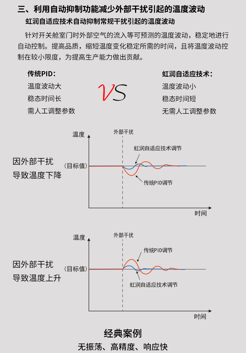 虹潤(rùn)公司是專業(yè)生產(chǎn)溫控器的國(guó)家專精特新“小巨人”企業(yè)。生產(chǎn)的傻瓜式智能溫控器,具有傻瓜式操作,真正人工智能算式,無(wú)需人工整定參數(shù),控制精度可達(dá)±0.1°C,高抗干擾等特點(diǎn)。產(chǎn)品獲得模糊PID控制儀及控制方法、人工智能調(diào)節(jié)器、智能化控制器、移相觸發(fā)控制器、閥門自動(dòng)手動(dòng)無(wú)擾動(dòng)操作控制方法及裝置等5項(xiàng)國(guó)家發(fā)明專利,主持起草工業(yè)過程控制系統(tǒng)用模擬輸入兩位或多位輸出儀表、物聯(lián)網(wǎng)智能溫度儀表通用技術(shù)條件、工業(yè)過程測(cè)量和控制系統(tǒng)用智能調(diào)節(jié)器等3項(xiàng)國(guó)家標(biāo)準(zhǔn),以及通信系統(tǒng)多通道數(shù)據(jù)采集控制終端規(guī)范軍用標(biāo)準(zhǔn),參與國(guó)際5G標(biāo)準(zhǔn)制定,取得傻瓜式模糊PID調(diào)節(jié)儀等3項(xiàng)相關(guān)軟件著作權(quán)。產(chǎn)品廣泛應(yīng)用于電力、石化,冶金、制藥、食品等幾乎所有工業(yè)現(xiàn)場(chǎng),實(shí)現(xiàn)精準(zhǔn)控溫,保障生產(chǎn)安全與質(zhì)量。