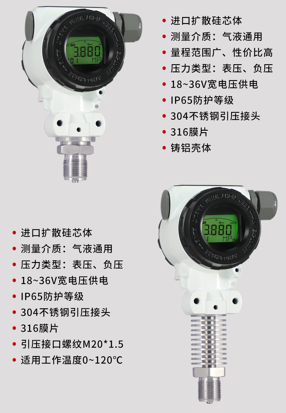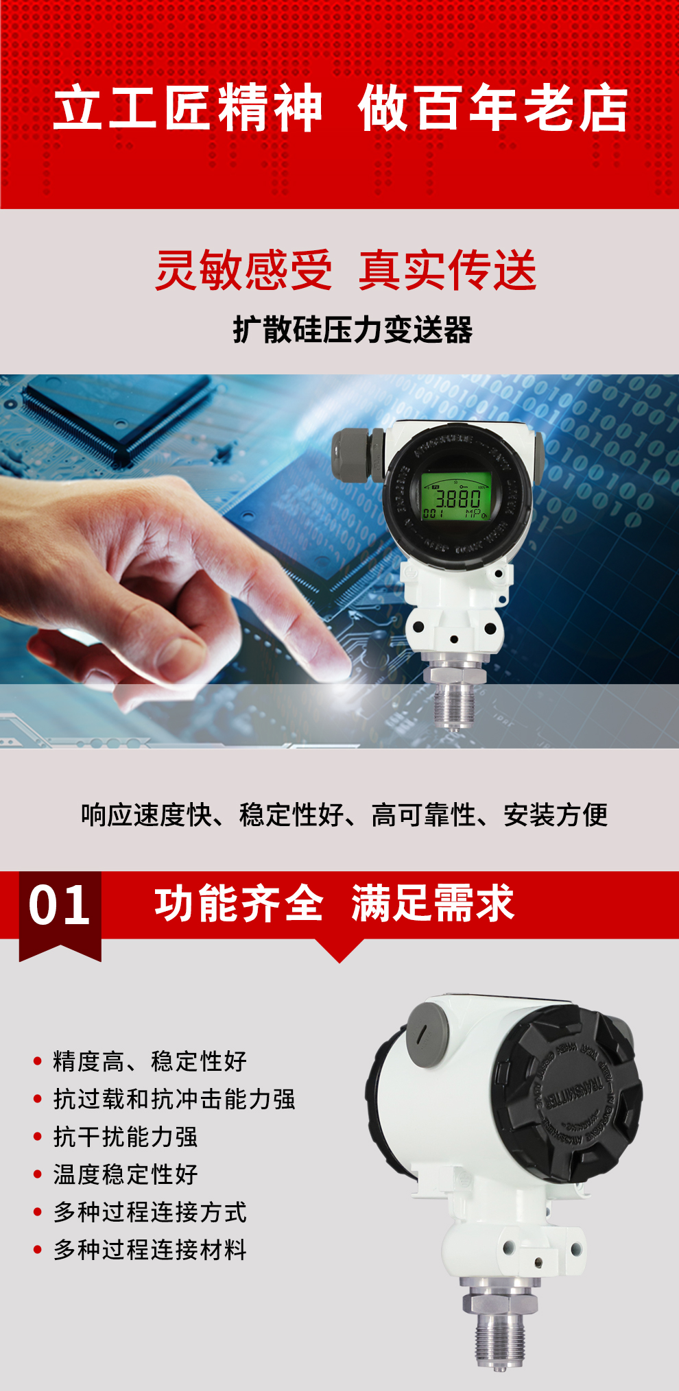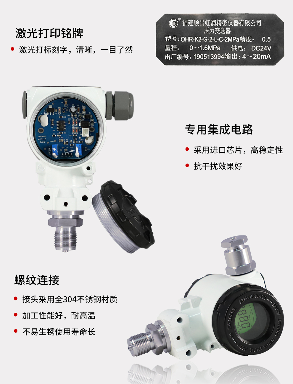 虹潤公司是專業(yè)生產(chǎn)壓力變送器的國家專精特新“小巨人”企業(yè),生產(chǎn)的擴散硅壓力變送器,具有精度高,穩(wěn)定性好,響應(yīng)速度快,高可靠性,抗過載和抗沖擊能力強,安裝方便等特點。產(chǎn)品獲得一種數(shù)字顯示低功耗壓力表、一種信號發(fā)生器裝置等2項國家發(fā)明專利,主持起草工業(yè)過程控制系統(tǒng)用模擬輸入兩位或多位輸出儀表、工業(yè)過程測量和控制系統(tǒng)用壓力/差壓變送器等2項國家標準,通信系統(tǒng)多通道數(shù)據(jù)采集控制終端規(guī)范軍用標準,以及現(xiàn)場設(shè)備集成等5項智能制造國家標準。參與國際5G標準制定,取得數(shù)顯壓力表等2項相關(guān)軟件著作權(quán)。產(chǎn)品廣泛應(yīng)用于化工、食品、制藥、電力、設(shè)備配套、供暖、水處理、樓宇等行業(yè),需精準測量流體壓力的現(xiàn)場。