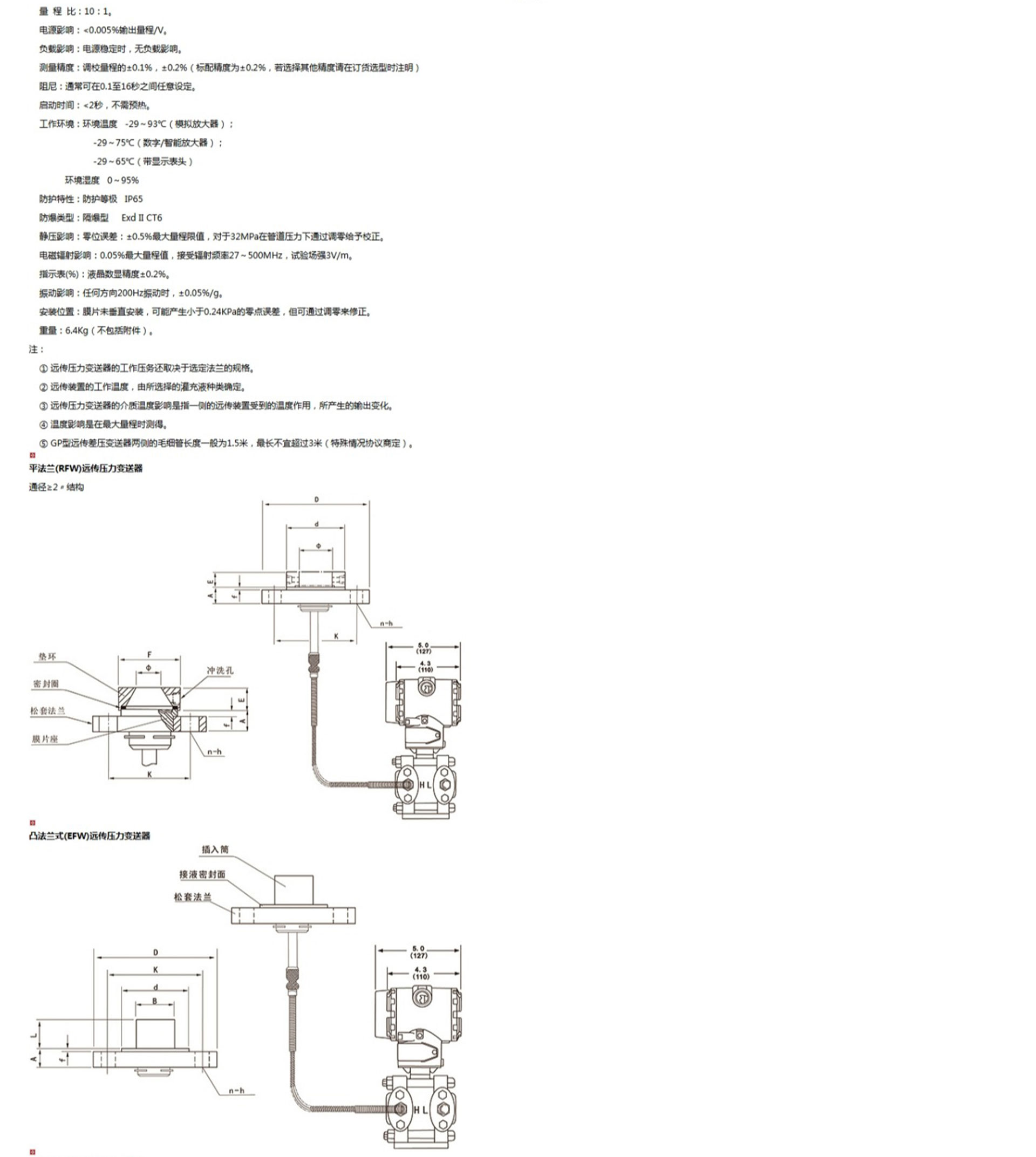 HR-3051GP遠(yuǎn)傳壓力變送器是一種通過安裝在管道或容器上的遠(yuǎn)傳裝置來感受被測壓力,該壓力經(jīng)毛細(xì)管內(nèi)的灌充硅油(或其它的液體)傳遞至變送器的主體,然后由變送器主體內(nèi)的δ室和放大線路板,將壓力或差壓轉(zhuǎn)換4~20mA.DC信號(hào)輸出。