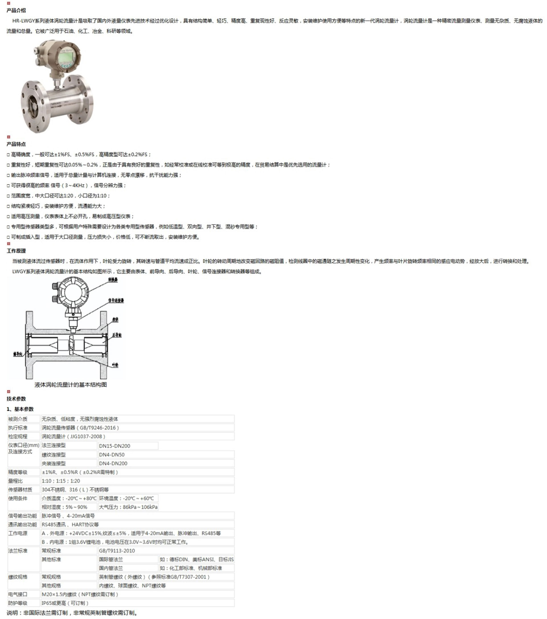 HR-LWGY系列液體渦輪流量計(jì)是吸取了國(guó)內(nèi)外液量?jī)x表先進(jìn)技術(shù)經(jīng)過(guò)優(yōu)化設(shè)計(jì),具有結(jié)構(gòu)簡(jiǎn)單、輕巧、精度高、重復(fù)現(xiàn)性好、反應(yīng)靈敏,安裝維護(hù)使用方便等特點(diǎn)的新一代渦輪流量計(jì),渦輪流量計(jì)是一種精密流量測(cè)量?jī)x表、測(cè)量無(wú)雜質(zhì)、無(wú)腐蝕液體的流量和總量。它被廣泛用于石油、化工、冶金、科研等領(lǐng)域。